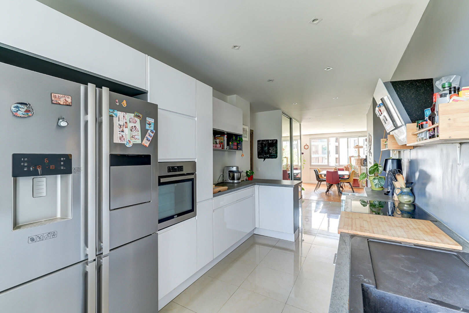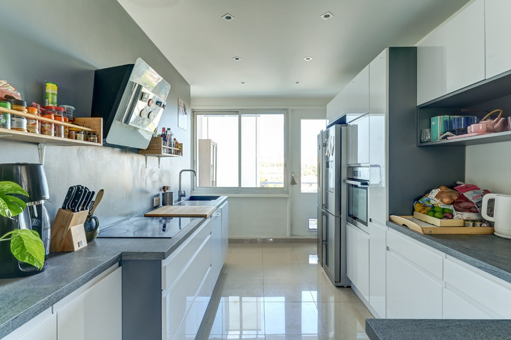 Grand séjour lumineux donnant sur un accès extérieur, belle cuisine ouverte et équipée donnant sur un second balcon,